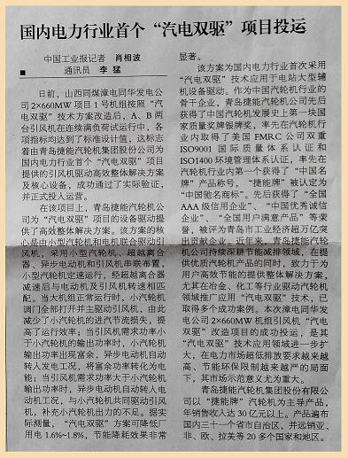 近日,由我公司提供方案和設(shè)備的山西同煤漳電同華發(fā)電公司2x660MW#1機(jī)組引風(fēng)機(jī)“汽電雙驅(qū)”改造項(xiàng)目成功投入運(yùn)行。作為國(guó)內(nèi)電力行業(yè)首個(gè)“汽電雙驅(qū)”項(xiàng)目,我公司提供的“汽電雙驅(qū)”技術(shù)方案引起了國(guó)內(nèi)主流媒體的關(guān)注,10月17日,《中國(guó)工業(yè)報(bào)》、中國(guó)工業(yè)新聞網(wǎng)以《國(guó)內(nèi)電力行業(yè)首個(gè)“汽電雙驅(qū)”項(xiàng)目投運(yùn)》為題,予以了宣傳報(bào)道。